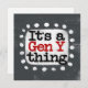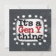 "É uma Coisa Gen Y" é um design de texto fofo em cinzas com texto preto e vermelho, junto com uma forma de sotaque branco e pontos brancos texturizados ao seu redor.