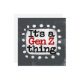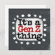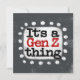 "É uma Coisa Gen Z" é um design de texto fofo em cinzas com texto preto e vermelho, junto com uma forma de sotaque branco e pontos brancos texturizados ao seu redor.