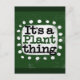 "É Uma Coisa de Plantas" é um design de texto bonito em verde com texto preto e vermelho, junto com uma forma de sotaque branco e pontos brancos texturizados ao seu redor.