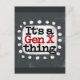 "É Uma Coisa Gen X" é um design de texto fofo em cinzas com texto preto e vermelho, junto com uma forma de sotaque branco e pontos brancos texturizados ao seu redor.