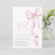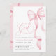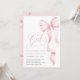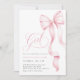 É um convite para Chás de fraldas de Fita Rosa. Este convite elegante apresenta um encantador arco cor-de-rosa pincelado e um roteiro manuscrito romântico, perfeito para um chá de menina caprichosa. A fita chic e a design de pré-disquete adicionam um toque de sofisticação, enquanto a modelo editável permite uma fácil personalização. Crie um convite bonito e memorável para o seu evento especial.