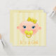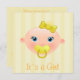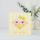 Um doce convite de chá de fraldas em tons amarelos, uma linda cara de bebê com um pacificador e um arco em um fundo listrado de pasta amarela.