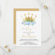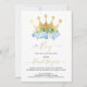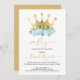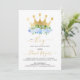 É um menino, flores e coroa dourada, convite de festas de chá de menino: branco azul e cores douradas.