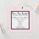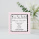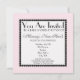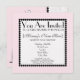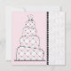 Um convite de chá de fraldas com um fundo de rosa claro com trim de ponto preto na frente e atrás. Personalize a frente com detalhes da sua ocasião. O dorso apresenta um bolo branco com um padrão de diamante rosa. O bolo é quatro arredondado ao centro e tem uma carruagem de bebê no topo. Texto à direita diz "É uma garota".