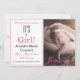 Celebre o nascimento de sua nova menina com este doce e adorável "É uma garota!" Anúncio de Nascimento da Garota Bebê. Substitua a foto pela sua. Personalize a fonte e a cor rosa e preta do texto à sua escolha ou mantenha este estilo popular de tipografia simplesmente usando o menu de edição. Um padrão floral branco e rosa suave é apresentado no verso do convite. Outras cores e padrões, adesivos correspondentes, envelopes e etiquetas de endereço de retorno estão disponíveis.