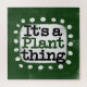 "É Uma Coisa de Plantas" é um design de texto bonito em verde com texto preto e vermelho, junto com uma forma de sotaque branco e pontos brancos texturizados ao seu redor.