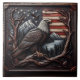 Uma escultura detalhada de uma águia majestosa empoleirada em um galho, colocada contra um pano de fundo com montanhas e a bandeira americana.