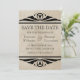 Na moda e chic Elegant Deco Salve o Anúncio de Data com um par de espirais de arte deco florescem fronteiras em ebony e uma imagem de fundo texturizada em um bege suave. Isto salve o convite para a data tem charme rústico enquanto mantém um belo talento sofisticado. Absolutamente perfeito para o casamento temático vintage de 1920. Fácil de personalizar, basta adicionar os detalhes do casamento nos campos de texto fornecidos. Clique em "Personalizar" para encontrar mais opções de personalização, como alterar fontes ou cores de texto.