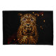Eclipse Majestade, mostre um leopardo com pele de ouro brilhante e manchas distintas, colocado sobre um fundo escuro. Os olhos do leopardo estão iluminados em roxo brilhante, criando um efeito marcante e místico. Os arredores escuros são acentuados por luzes espalhadas e quentes, dando à cena uma atmosfera dramática quase de outro mundo.