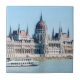 Budapeste, Hungria - Parlamento Húngaro Edifício em Budapeste com barco de cruzeiro branco e rio Danúbio em primeiro plano