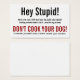 Perfeito para os idiotas que não entendem os perigos de deixar seus queridos animais de estimação em um veículo quente para vagarosamente sufocar e possivelmente morrer de um derrame de calor. Avise-os para não tentarem novamente com este cartão de visita de texto preto e vermelho ousado que você pode colocar sob um limpa-para-brisa. Se um animal estiver claramente em perigo, por favor contacte imediatamente uma agência de animais que irá bater a janela.