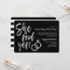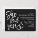 Um convite divertido e único com letras cursivas branco sobre preto, feito sob medida para a sua festa ou jantar de noivado. Ele apresenta as palavras "Ela disse sim!" com alianças de casamento ao lado. Na lateral, há espaço para as informações da sua festa ou evento especial.