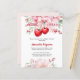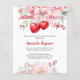 Um fundo branco elegante, decorado com um arco cor-de-rosa com cerejas e flores cor-de-rosa. Personalize e adicione um nome e detalhes da parte. Texto: Ela é a Cherry no topo de trás: fundo rosa macio. 1 folha = 1 convite impresso de borda a borda.