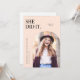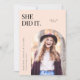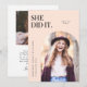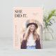 Cartão de anúncio de graduação moderno, com um quadro de cor de pêssego para sua foto. O texto diz "ELA FEZ ISSO."