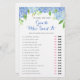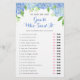 Este jogo de chá de panela é um jogo que ele disse, ela disse adivinhem quem disse. Apresenta um design floral azul de hidrocasta azul. Você pode personalizar o texto com suas próprias perguntas. Fornecimentos correspondentes de chá de panela disponíveis.
