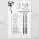 Ele disse que ela disse que o Na moda e eterno do Chá de panela Negro, o monocromo Arco negro "Quem foi o primeiro", ele disse que ela disse que o cartão de jogo apresenta um arco de fita preto pintado manualmente no canto superior, emparelhado com tipografia chica e lábios negros e ícones de bigode para um olhar limpo e moderno. Os hóspedes podem dar a volta aos seus palpites para quem foi o "primeiro" em vários momentos de relacionamento, fazer-o um jogo de chá de panela divertido e interativo. Copyright Anastasia Surridge, todos os direitos reservados.