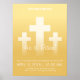 Perfeito para seus serviços de domingo de Páscoa! 3 cruza sobre um fundo de gradiente amarelo-ouro, com o texto "Ele é Risen!". Campos personalizáveis para informações adicionais sobre slogan, data e hora e endereço/contato. Todos os campos são personalizáveis, portanto, sintam-se livres para usar em outros feriados ou eventos da igreja.