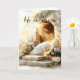 Este cartão de Páscoa apresenta uma bela e serena representação do túmulo vazio de Jesus Cristo. A entrada de pedra está aberta, com luz dourada radiante emanando dela, simbolizando a ressurreição. O túmulo é cercado por flores em flor, incluindo margaridas, aumentando a sensação de nova vida e esperança. Acima do túmulo, o texto "Ele Ressuscitou" está elegantemente escrito, capturando a essência da celebração da Páscoa.
