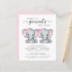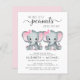Um convite para casal para meninas gêmeas bonitinho e amigável com "Dois Pequenos Amendoins Doce Estão A Caminho" escrito em tipografia moderna de cinza mole e um roteiro de na moda, e duas aquarelas cor-de-rosa pastel de elefantes bebês. Adicione os nomes dos futuros pais e os detalhes do chá em uma simples tipografia de cinza.