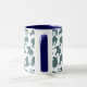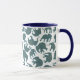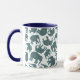 Uma caneca de café Ringer divertida, com silhuetas elefantes, cheia de um padrão de Paisley azul escuro e burgundy, sobre um fundo branco que você pode mudar se quiser. Parte da coleção Posh & Painterly 'Heffalumps'.