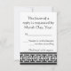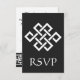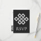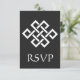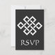 Esta elegante placa RSVP apresenta um fundo preto e um grande nó de sorte chinês em branco na frente. Uma borda preta ao longo da borda inferior da placa com um padrão geométrico branco inspirado pela ornamentação chinesa decora a parte de trás com algum texto de amostra no lugar acima que pode ser personalizado para ajustado de suas necessidades. Certifique-se de verificar os outros produtos no conjunto de Elegância Chinesa em Preto para criar uma pesquisa verdadeiramente coordenada para o seu evento.