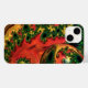 Um design fractal vibrante e complexo apresenta padrões giratórios e uma esfera flutuante com um padrão intrincado semelhante. As cores são predominantemente laranja e vermelha, com acentos de verde nas formações fractais, dando à composição uma sensação energética e dinâmica.