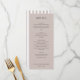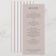This elegant wedding menu features a simple, vertical layout with a light beige background and muted tones that create a classic and sophisticated aesthetic. The design is divided into sections for starters, salad, main course, and dessert, each highlighted by clean typography in serif and sans-serif fonts, ensuring clarity and readability. Customizable placeholders allow for personalization with names and dates, making it perfect for formal occasions. The overall mood is refined and inviting, ideal for couples seeking a timeless and harmonious presentation for their special day.