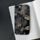 An elegant, striking design of dark black and grey flowers outlined in gold, set against a black background.