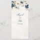 A beautiful menu for your winter wedding table with elegant navy blue and cream watercolor flowers, customizable with your dinner details, available in a wide range of matching wedding products.