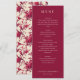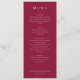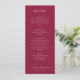 This elegant wedding menu features a deep maroon background with crisp white text, creating a sophisticated and formal atmosphere. The layout is clean and structured, with sections for Starters, Salad, Main Course, and Dessert, each clearly defined by dotted lines and presented in a classic serif font. The minimalist design emphasizes readability and refinement, making it perfect for an upscale event. Customizable placeholders allow for personalization, ensuring the menu can be tailored to any couple's special day.