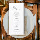 Designed with understated luxury in mind, this menu complements formal, black tie, romantic, and contemporary wedding aesthetics. The structured sections for appetizers, main course, drinks, and desserts keep your reception details polished and easy to read, while the airy spacing enhances the elevated feel.