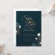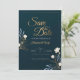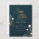 Featuring a deep, classic navy blue background accented with a delicate gold foil-style frame and script, this design exudes sophistication. Stylized white and gold floral illustrations adorn the corners, adding a touch of romance and botanical charm.
