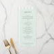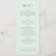 This elegant wedding menu features a clean, minimalist layout with a soft pastel green background that exudes sophistication. The design uses a combination of serif and sans-serif fonts to create a formal yet inviting atmosphere, with well-spaced sections for starters, salad, main course, and dessert. Each section is clearly marked, making it easy for guests to navigate the offerings. Customizable placeholders allow for personalization with names and dates, perfect for creating a memorable dining experience at your special event.