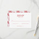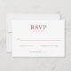 This elegant wedding RSVP card features a minimalist design with a clean white background and a deep red color palette, creating a striking contrast. The layout is simple yet sophisticated, utilizing serif typography for a classic touch, with bold "RSVP" text at the top and clear response options below. The design exudes formality and anticipation, making it perfect for couples seeking an understated yet refined invitation style. Its straightforward composition ensures clarity and focus on the essential RSVP details, ideal for formal occasions.