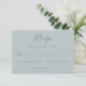 This wedding RSVP card features a minimalist and elegant design with a soft, muted teal background that creates a serene and sophisticated atmosphere. The layout is vertically oriented, with ample negative space enhancing the focus on the text elements. A combination of cursive script for "RSVP" and clean sans-serif fonts for the response options adds subtle visual interest while maintaining readability. Perfect for formal events, this card conveys an understated elegance, making it ideal for couples seeking a modern yet classic invitation style.