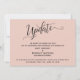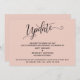 A distinção deste conjunto deve-se à fonte elaborada e giratória do script usada para frases de sotaque. Se precisar avisar seus hóspedes que seu casamento foi adiado, este cartão oferece uma opção elegante e simples. Nesta peça, a letra da caligrafia foi usada para criar um gráfico com a palavra "Atualizar". Use os campos modelo para adicionar seus detalhes pessoais e tornar este design seu. O plano de fundo pode ser alterado para qualquer cor que você preferir. Por favor, responda a quaisquer solicitações especiais ou personalize a assistência. 98 //