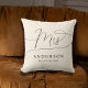 O design mostra uma almofada elegante e minimalista em preto e creme. Um lindo texto "mrs" único em caligrafia caprichosa no topo e um sobrenome e data personalizáveis na parte inferior. O design é extremamente único e clássico e será um item elegante para dar a qualquer noiva ou recém-casada como presente.