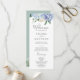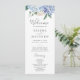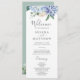 Este elegante programa de casamento branco da hydrangea azul é perfeito para um casamento de primavera ou verão. O clássico design floral apresenta faixas de cor azul-d-água de pó macio, acentuadas com flores cor-de-rosa e folhas verdes, cor-de-rosa e borrado neutro. Inclua o nome da noiva e do noivo, a data e o local do casamento, a mensagem do obrigado, a ordem do serviço, a festa noiva e um memorial "em memória amorosa" opcional.