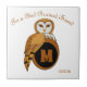 Uma ilustração de uma elegante coruja britânica é tirada do lado com a cabeça olhando sobre o ombro. Um globo ocular monograma está aninhado sob a asa do pássaro. O M é pequeno para monograma e pode ser personalizado para o seu começo.