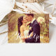 Simples e elegante modelo de cartão de agradecimento de casamento com foto horizontal / paisagem com sobreposição de texto "Obrigado" em branco e uma mensagem personalizada da noiva e do noivo no interior que pode ser personalizada.
