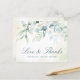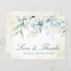 Elegante cartões de agradecimentos de casamento orçamentário com folhas de eucalipto e verde com uma dica de azul e manchas de brilho falsa de ouro no topo. Abaixo está "amor e obrigados" em um roteiro verde escuro junto com seus nomes, sobre uma lavagem a aquarela pastel. O verso tem sua mensagem pessoal. Esta simples e rústica design é excelente para um casamento de temas botânicos no verão. Estes cartões de agradecimento são excelente de um novo casal que quer cartas de agradecimento sem fotos.
