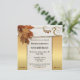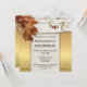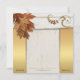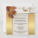 Um convite de aniversário com folhas de queda rústicas em um painel branco de madeiras intacto, emoldurado por painéis metálicos dourados. As folhas de outono não só são adequadas para um aniversário sazonal, como também podem representar a queda da vida, e referem-se a um aniversário "sobre a colina" (piscar os olhos).