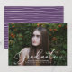 Convites de formatura elegantes com a foto horizontal do graduado com "Graduate" em letras brancas. Personalize a frente do convite de formatura adicionando o nome do graduado, nome da escola e ano de graduação. O anúncio reverte para exibir um padrão de listras desenhadas roxas e brancas.