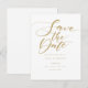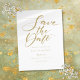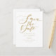 Este cartão de save the date minimalista e elegante apresenta um convite em script chic acima dos seus detalhes em tipografia dourada elegante. Criado por Thisisnotme©