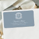 Estas etiquetas elegantes de endereço de retorno de casamento em azul poeira formal apresentam uma crista monograma em estilo vintage ornamentado com caligrafia sofisticada para as iniciais da noiva e do noivo. Encontre produtos correspondentes na coleção ou envie uma mensagem através do Zazzle Chat para mais produtos e ajustes de design.