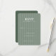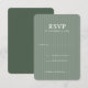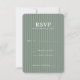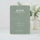 Este cartão de RSVP de casamento elegante apresenta um layout orientado verticalmente com listras verticais sutis em tons variados de verde, criando um fundo sofisticado e discreto. O design utiliza uma paleta de cores suaves de verdes e brancos, realçando sua estética formal e refinada. No centro do cartão está uma tipografia serifada limpa que guia os convidados através de campos personalizáveis para seus nomes, aceitação ou declínio, e o número de acompanhantes, garantindo clareza e facilidade de uso. A abordagem minimalista enfatiza a funcionalidade, mantendo um tom convidativo, tornando-o perfeito para comunicações formais de casamento.