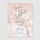 Um design moderno, chic, com um elegante fundo de mármore, aparado com brilho falso em tons de ouro rosa, cor-de-rosa e branco. As palavras "Salvar a Data" e os primeiros nomes da noiva e do noivo aparecem no script de cinza de carvão, com o texto restante na fonte sans serif.