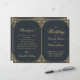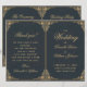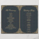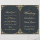 Um elegante programa de casamento dobrado com um ar vintage, tendo em ambos os lados duas molduras decorativas barrocas douradas idênticas em torno dos textos. Os títulos e os nomes da noiva e do noivo são escritos em uma elegante fonte caligráfica, o restante em maiúsculas. O fundo é azul escuro, o texto é dourado, semelhante às molduras douradas.