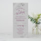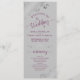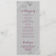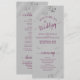 Este lindo programa de casamento apresenta um design elegante com texto roxo cassis ou magenta sobre um fundo cinza e espirais e ondulações prateadas em foil falso cinza prateado nos cantos. Os títulos são escritos em caligrafia sofisticada e há espaço para os detalhes da sua cerimônia e cortejo, bem como um breve agradecimento aos seus convidados. Uma maneira maravilhosa de dar as boas-vindas aos amigos e familiares para a celebração do seu casamento.