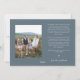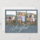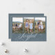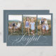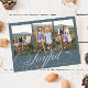 Modelo de cartão de foto de férias minimalista e moderno com 3 fotos e um texto em script que diz "alegria" na parte inferior. Você também pode adicionar outra imagem e mensagem no verso. O fundo é azul ardósia.